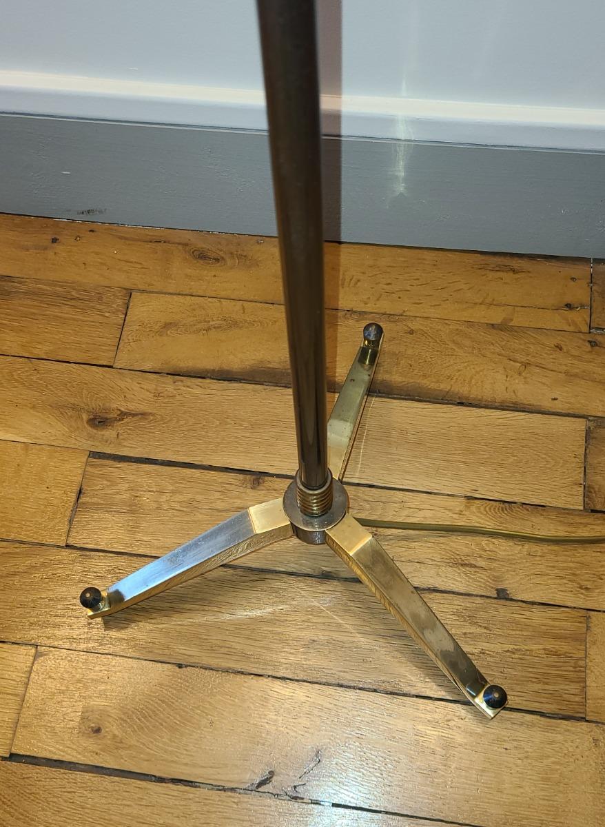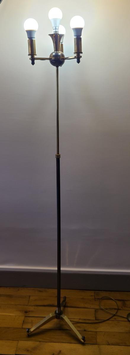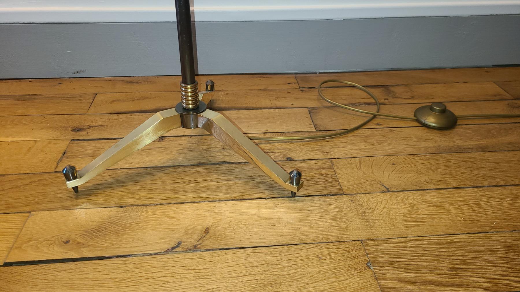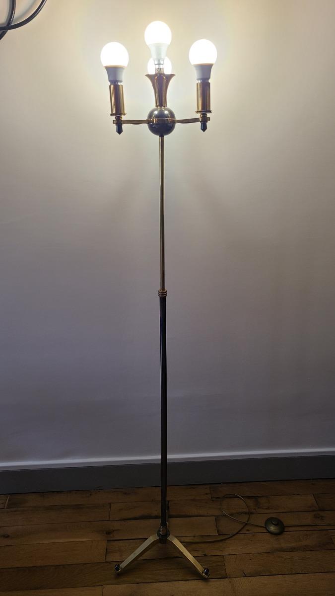 Lampadaire estampillé de la maison PETITOT crée en 1860 par Henri PETITOT par la fabrication de luminaire d'église et public, c est le fils qui développe l atelier pendant les années 30 à travers une production de lampadaire et lustre majestueux . Le modèle présenté est des années 50 il est composé d un pied et de la partie haute en bronze, le fut et la sphere sont en acier teinté canon de fusil (bleui) le reste des éléments est en laiton . Belle patine du temps il vous reste a trouver un abat jour qui embellira votre interieur.