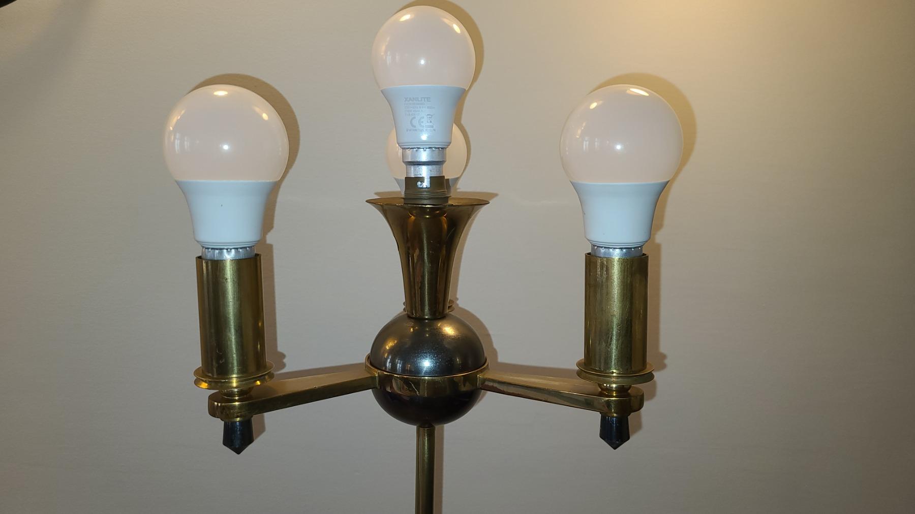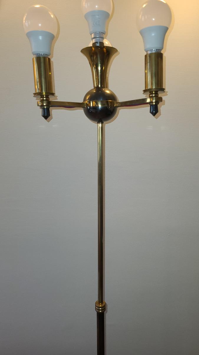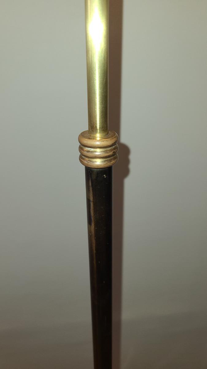 Lampadaire estampillé de la maison PETITOT crée en 1860 par Henri PETITOT par la fabrication de luminaire d'église et public, c est le fils qui développe l atelier pendant les années 30 à travers une production de lampadaire et lustre majestueux . Le modèle présenté est des années 50 il est composé d un pied et de la partie haute en bronze, le fut et la sphere sont en acier teinté canon de fusil (bleui) le reste des éléments est en laiton . Belle patine du temps il vous reste a trouver un abat jour qui embellira votre interieur.