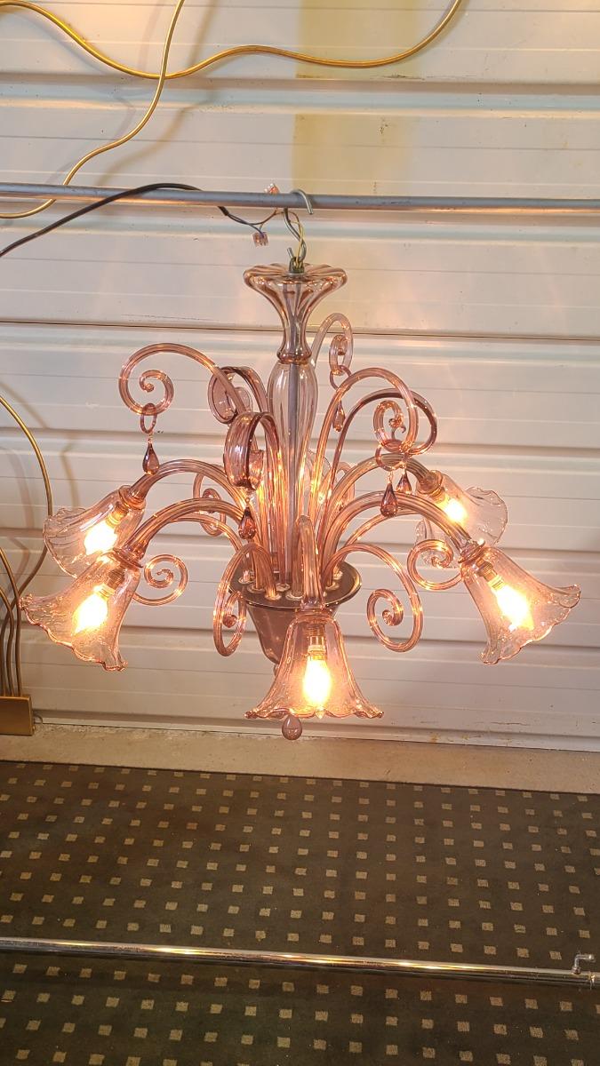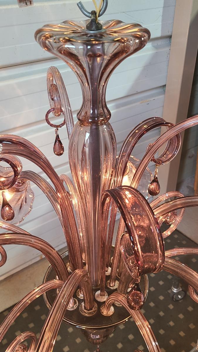 Lustre violet /rose de style art nouveau et d époque 1920/ 1930 à 6 bras de lumière agrémenté de palme stylisée en parfait état.